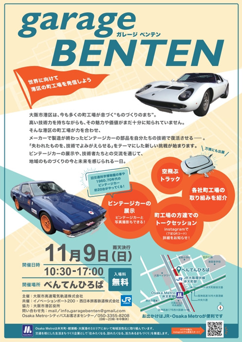 「Osaka Metroエリアリノベ―ションプロジェクト」第2段エリアの弁天町にて、町工場の技術力を結集させたイベントを開催します! - イベントの背景 Osaka Metroでは、プロジェクト第2弾として、中央線「弁天町」「朝潮橋」「大阪港」の3駅周辺エリアの魅力を発信する活動を行っています。(>>詳しくはこちら!) 古くから海の玄関口として栄えた大阪市の港区エリ……